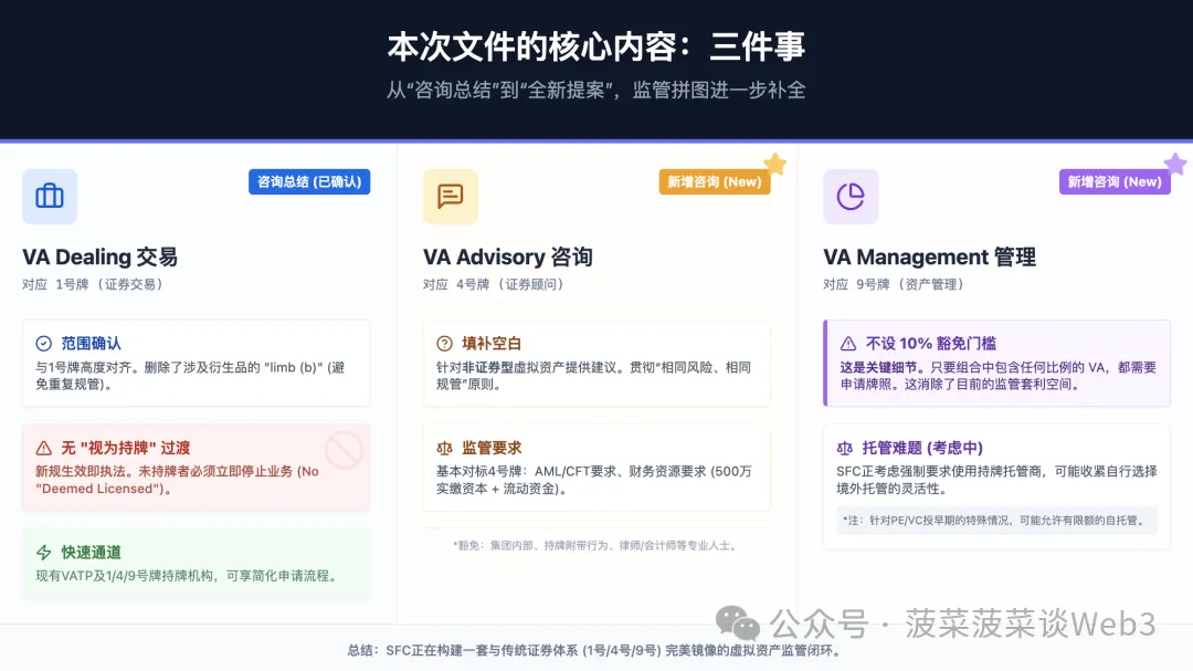 新增独立的 VA Advisory 牌照,是为了填补这一监管空白,确保"相同活动、相同风险、相同规管"原则的贯彻。