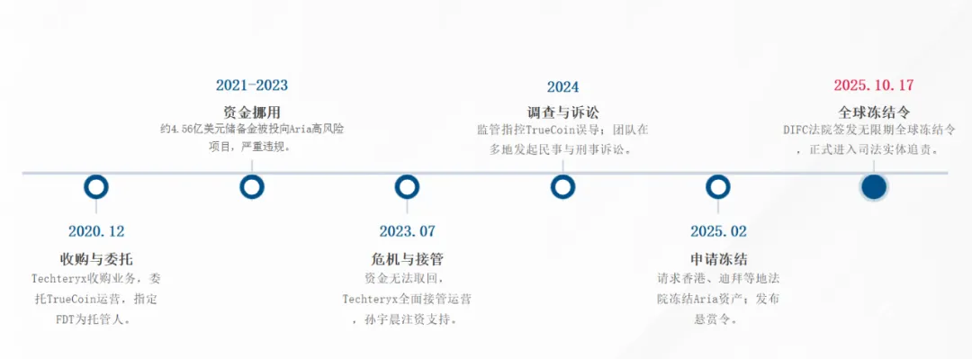随后,TUSD 项目方在孙宇晨支持下,启动了一场 “全球资产保全” 法律战。在香港诉讼中,FDT 被指控违反信托契约并被索赔。在迪拜诉讼中,Techteryx 针对资金最终流入方 Aria Commodities DMCC,要求法院确认该笔资金法律上仍属于 Techteryx。2024 年 9 月,美国 SEC 公开定性 TrueCoin 的欺诈行为。据 2025 年 10 月 17 日的最新消息,迪拜国际金融中心法院作出突破性裁决,签发了无限期全球资产冻结令,冻结 Aria Commodities DMCC 及其关联方价值 4.56 亿美元的全球资产。
