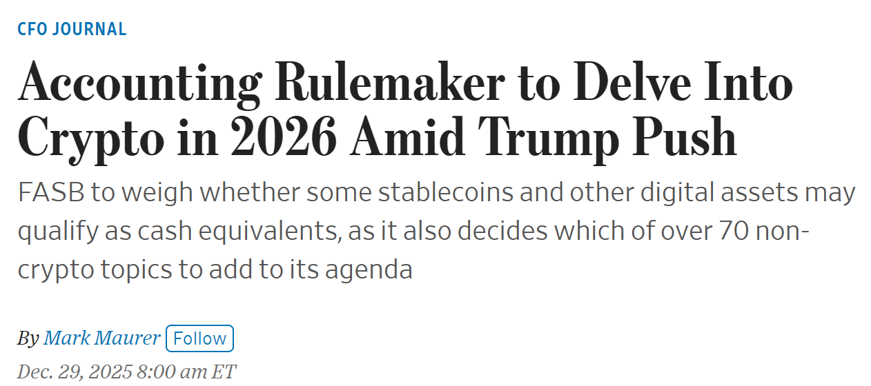 - 美国会计准则委员会计划 2026 年探索将部分稳定币列为「现金等价物」