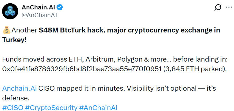 - 加密交易平台 BtcTurk 再遭黑客攻击,损失约 4800 万美元