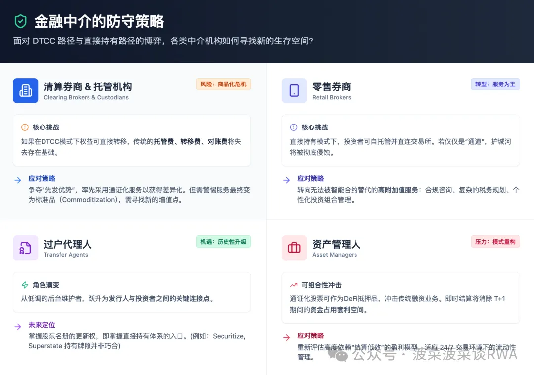 在 DTCC 模式下,它们的角色得到巩固——普通投资者依然只能通过券商触达市场。但直接持有模式的扩散会侵蚀这一护城河。如果投资者可以自己托管 SEC 注册股票,并在合规的链上交易所交易,零售券商的存在价值是什么?答案可能在于服务:合规咨询、税务规划、组合管理——那些无法被智能合约替代的高附加值功能。