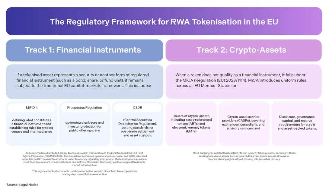 在欧盟,法律框架现在遵循两条不同的路径:金融工具路径适用于代币代表受监管的工具,例如债券、基金或股票,包括 MiFID II、招股说明书条例和 CSCR;加密资产路径涵盖不符合证券定义且受 MiCA 监管的代币。