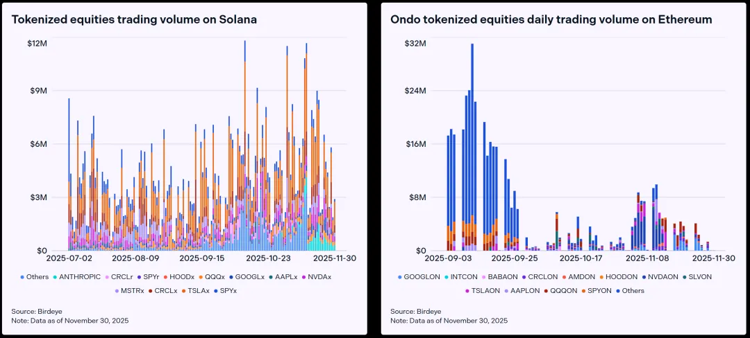 - 代币化股票于 2025 年 8 月和 9 月推出,并获得了显著的市场认可,在以太坊上的市值达到 2.2504 亿美元,在 Solana 上的市值达到 1.9958 亿美元。周末传统股票市场休市时,交易量有所下降,但链上价格发现机制仍在继续。
