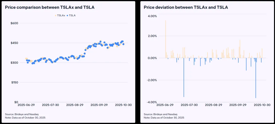 虽然代币化股票并不代表对标的股票的法律所有权,但它们确实为用户提供了一种便捷的方式来获得标的股票的经济敞口。通过对特斯拉股票代码 TSLA 及其在 Solana 平台上由 Backed Finance 开发的链上代币化版本 TSLAx 的分析表明,代币化股票的价格与其对应的真实股票价格密切相关。每日价格偏差在 -5.02% 至 3.45% 的小范围内波动。
