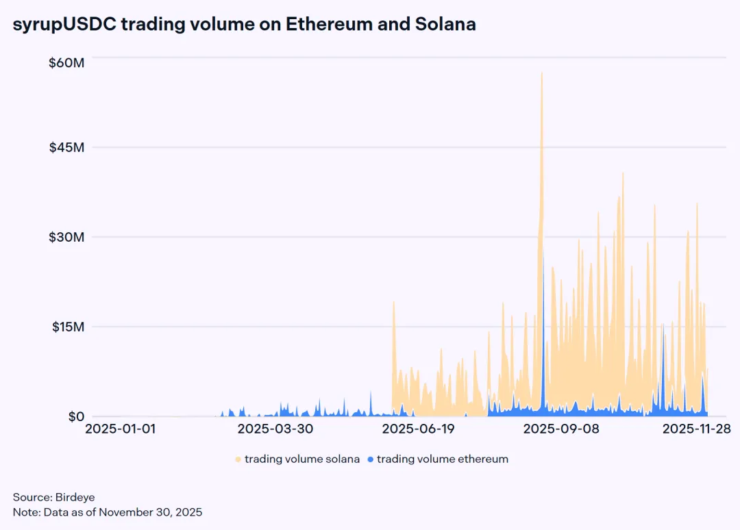 在 DEX 上,syrupUSDC 在 Solana 上的流动性达到 3913 万美元,是以太坊(1986 万美元)的两倍。Solana 的日均交易量为 983 万美元,是以太坊(97.2 万美元)的 10 倍。大部分交易活动发生在各自网络的主要 DEX 上,分别是以太坊的 Uniswap V4 和 Solana 的 Orca。