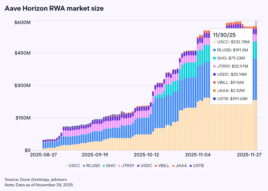 - 在零售方面,Aave 的 Horizon RWA 市场允许以 Centrifuge 的 JSTRY 和 JAAA、Superstate 的 USTB 和 USCC 以及 VanEck 的 VBILL 等资产进行借贷,市场规模在短短三个月内从推出时的 4814 万美元增长了 12 倍,达到 5.716 亿美元。