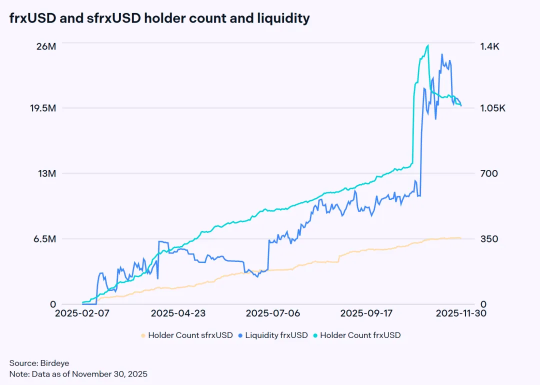frxUSD 是一种收益稳定币,默认情况下可从底层国债收益率中获得 3.85% 的收益,质押为 sfrxUSD 时则可获得 5.60% 的收益。截至 2025 年 11 月,frxUSD 的市值为 9836 万美元,流动性为 2190 万美元,以太坊上的日交易量为 331 万美元。frxUSD 的持有者数量从 2 月份的不足 10 人增至 10 月份的 729 人,而 sfrxUSD 的持有者数量达到 309 人,总收益支付额超过 133 万美元,总供应量接近 4322 万美元。