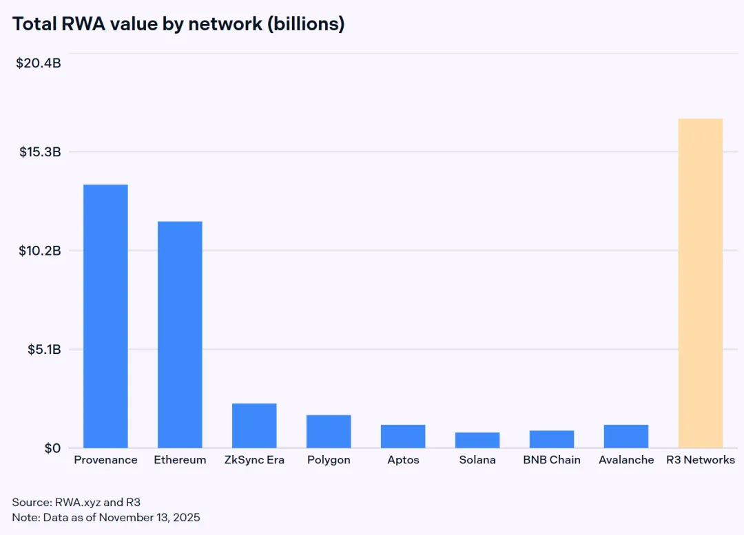 - R3 为机构客户提供价值 170 亿美元的代币化资产,并于 2025 年 5 月通过与 Solana 的战略合作进行了扩展,使受监管的机构能够直接在公共区块链基础设施上发行和结算 RWA。