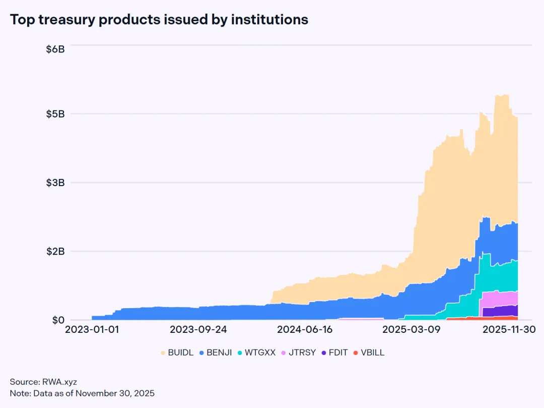 领跑市场的是 BUIDL,这是一款由贝莱德管理、通过 Securitize 发行的代币化货币市场基金,截至 11 月中旬,其在七个网络上的供应量已超过 28.5 亿美元。BUIDL 占据了所有代币化美国国债 34% 的市场份额。紧随其后的是富兰克林邓普顿自主发行的 BENJI,其在八个网络上的供应量为 8.5 亿美元;以及 WisdomTree 的 WTGXX,其在七个网络上的供应量已达到 6.2 亿美元。其他值得关注的发行包括 JTRSY(由 Anemoy 和 Janus Henderson 管理,通过 Centrifuge 发行)、FDIT(由富达自主发行)以及 VBILL(由 VanEck 管理,通过 Securitize 发行)。
