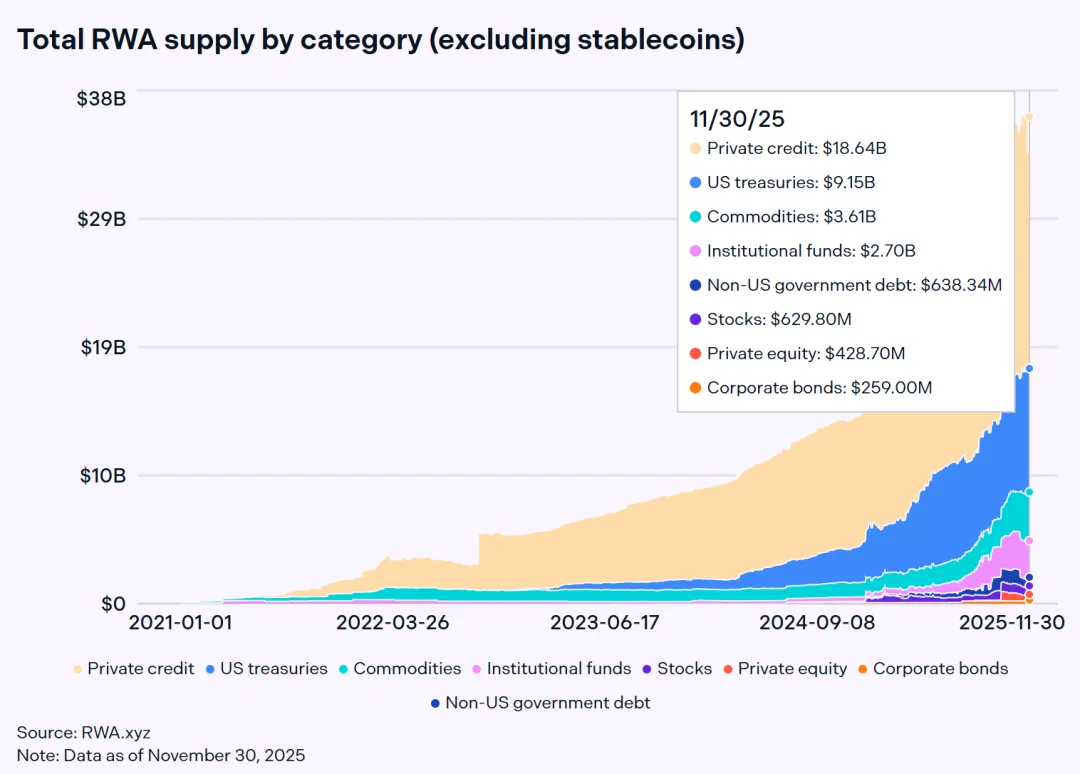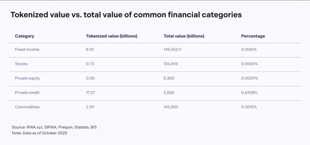 如上表所示,除私募信贷(占比 0.69%)外,大多数类别的代币化价值都微乎其微,不足市场总规模的 0.01%。这一巨大差距凸显了 RWA 领域仍处于发展初期,以及随着代币化进程的推进,其潜在增长空间巨大。