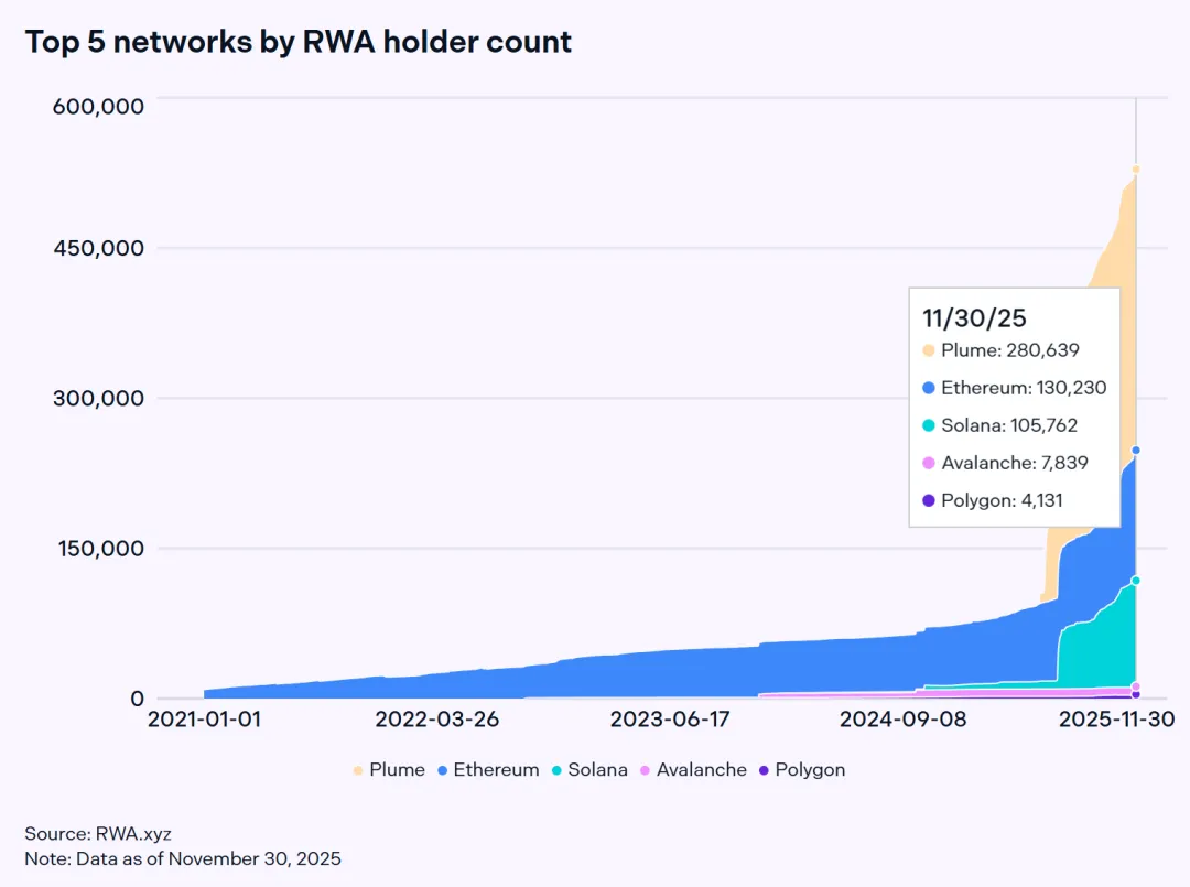 然而,就持有者数量而言,Plume 已大幅超越以太坊,拥有 280,639 位持有者,是以太坊 130,230 位持有者的 2.2 倍。Solana 位列第三,展现出惊人的增长势头,其持有者数量从 6 月底的 9,468 人飙升至 11 月底的 105,762 人。