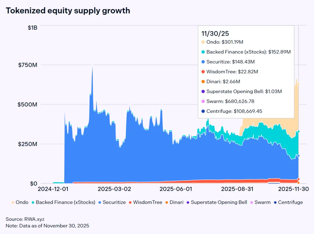代币化股票已成为增长最快的 RWA 类别,其供应量从 2024 年 10 月的 593 万美元飙升至 2025 年 11 月的 6.29 亿美元,增长了 106 倍。这一增长主要来自 Securitize 的 Exodus Movement,其在 Arbitrum 和 Algorand 平台上新增了超过 3 亿美元的代币。与此同时,Backed Finance 于 2025 年第二季度推出了其美国代币化股票产品 xStocks,目前已上线 1.5 亿美元资产。随后,Ondo Global Markets 在第三季度推出了 100 多只代币化股票和 ETF,迅速突破 1 亿美元大关,成为增长最快的代币化股票平台,其总锁定价值(TVL)也已累计超过 3 亿美元。