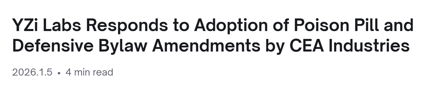- YZi Labs:谴责 CEA Industries 董事会采取毒丸计划并剥夺股东权利
