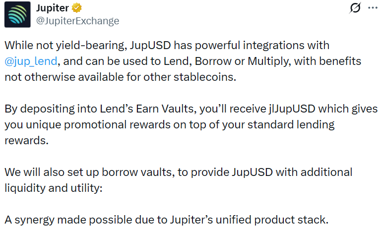 - Jupiter 正式推出其稳定币 JupUSD
