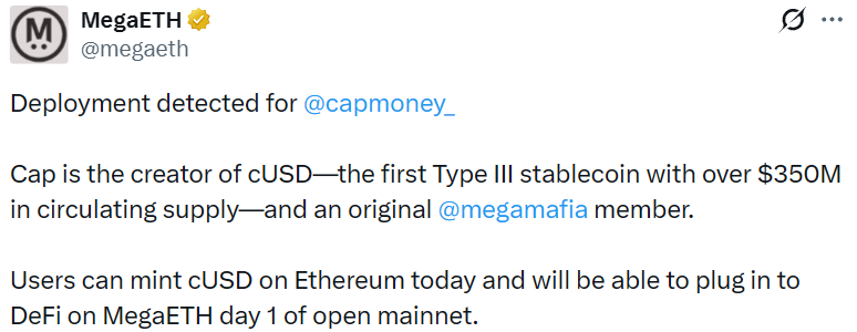 - 稳定币平台 Cap 已部署至 MegaETH