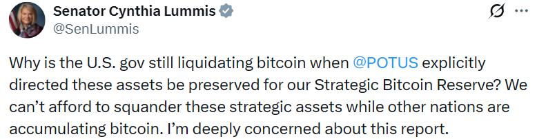 - 美参议员 Cynthia Lummis 质疑美国政府抛售比特币合法性