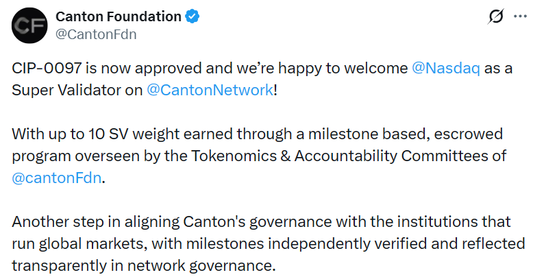 - Canton 基金会:纳斯达克成为 Canton Network 超级验证者