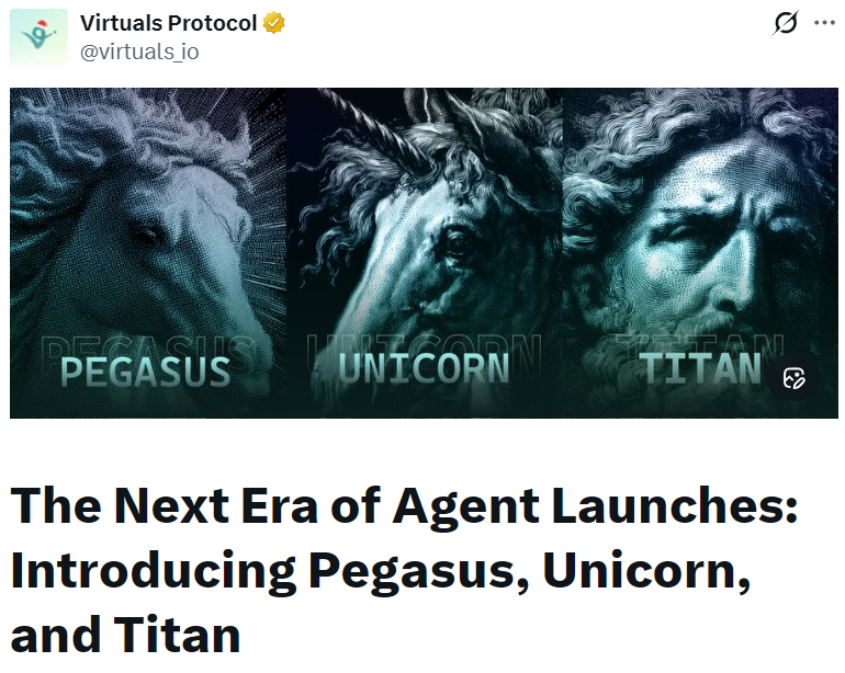 - Virtuals Protocol 推出 Pegasus、Unicorn 与 Titan 三种代理启动机制