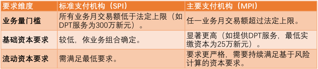 第二,关键的财务门槛要求:简单来说,业务规模(以月交易额衡量)决定申请类别:标准支付机构(SPI)或大型支付机构(MPI)。MPI 因规模大、风险高,须满足更严格的资本与流动性要求,企业需自行监控交易额,超标即须升级为 MPI。