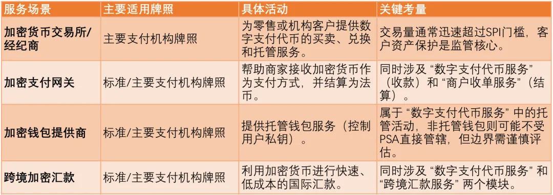 对于从事数字支付代币服务的企业,新加坡的《支付服务法》(PSA)构建了一套 “一个主牌照,多层业务模块” 的监管体系。