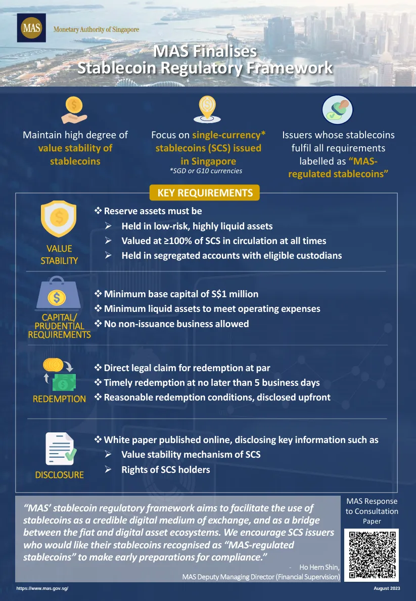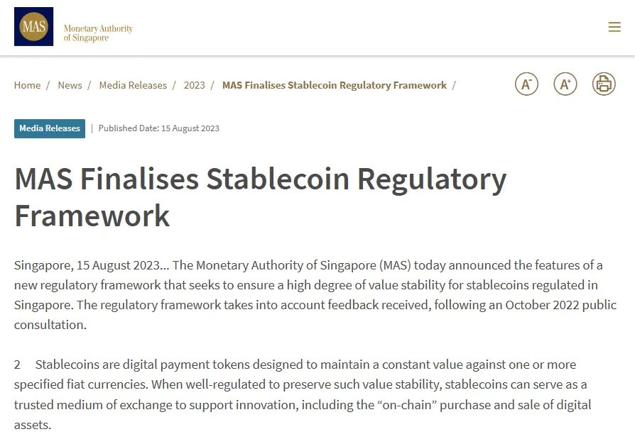 在稳定币的交易,转账,收单和托管服务功能上,由于稳定币专门法规还未发行,仍依新加坡于 2023 年发布的《稳定币监管框架》被视为一种特别的数字支付货币,目前仍适用 PSA 下有关 DPT 的相关规定。