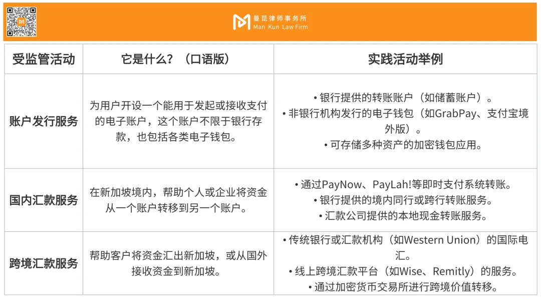 PSA 在其附表一中列出了一份 “支付服务清单”,如果你在新加坡从事的业务属于清单上的任何一项,就需要根据业务规模和类型,申请对应的支付机构牌照,其中和加密货币支付相关的我们可以分为以下几类: