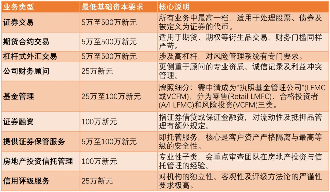 第二,关键的财务门槛要求:财务稳健性是 MAS 评估的重点,不同业务对应的最低基础资本要求差异显著。