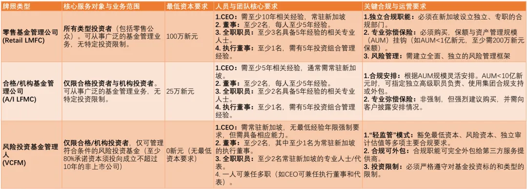 - 监管要求:要求最严格,除了 SPI 的所有要求外,还需满足更高的实缴资本要求(通常为 25 万新元起)、更严格的客户资金隔离保管(如需要通过法定信托账户)、更全面的风险管理框架和定期独立审计义务。