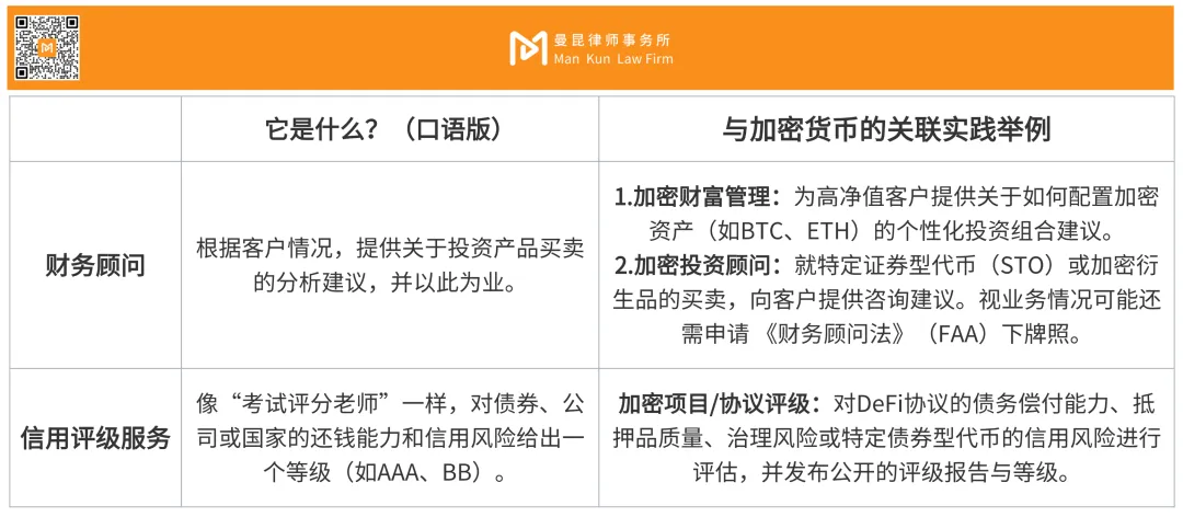 这类活动核心是提供专业建议、评估或研究,以此影响投资决策。如果你的业务不是直接交易或管理资产,而是通过专业意见、分析或评估来影响他人的投资行为,并以此营利,就属于这类。