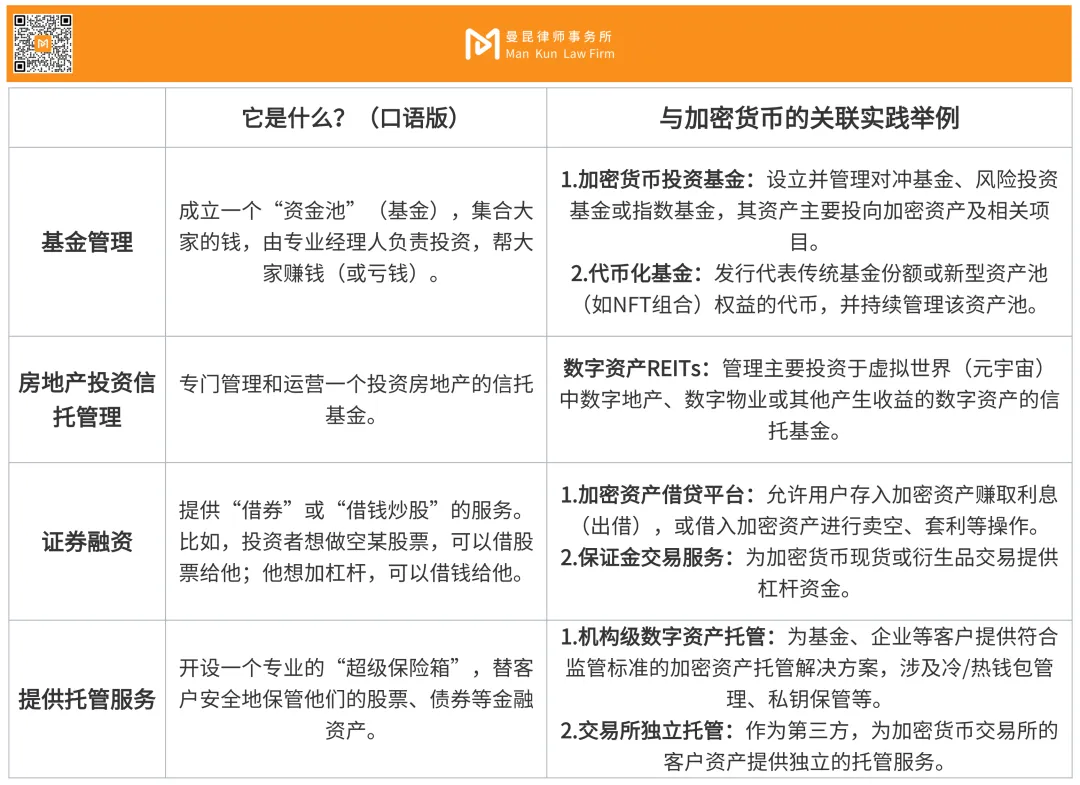 这类活动核心是替别人保管资产,或者帮别人打理投资,只要你控制或管理着别人的金融资产(无论是法币、传统证券还是加密资产),并以此提供服务,就属于这类。