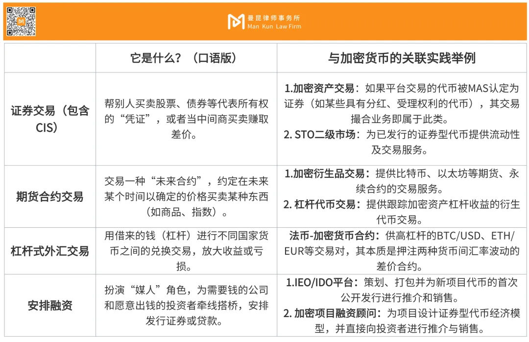 具体而言,新加坡所允许的数字资产服务类型都列在 SFA 的第二附表(Second Schedule)中,为了让大家能看懂这些 “金融业务” 到底是什么、和加密货币有什么关系,我们可以把这些活动归纳为三大类: