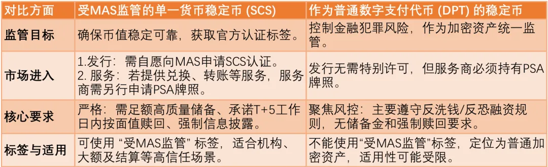 而稳定币的发行主要受《支付服务法》(PSA)和《稳定币监管框架》规制,因为其既有电子货币稳定、锚定法币的血统,又有数字支付代币(DPT)自由、可编程的基因,这种双重身份也决定了监管是 “混合双打”。若发行方希望通过接受更严格监管的方式,提升稳定币的可信度,并吸引机构和大额交易用户,可以自愿申请推出 “受 MAS 监管的稳定币”(满足类似电子货币发行的高额高质量储备、独立托管、赎回保障和信息披露要求),从 MAS 处取得单一货币稳定币 (single-currency stablecoins,SCS) 认证;若发行方