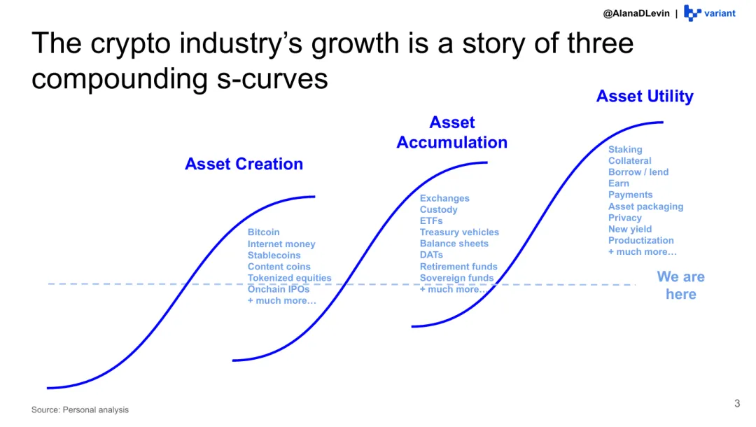 具体来看,加密货币的产业构成和发展历程,不是一步到位,而是一浪叠一浪,整个行业可以看成三条堆在一起的 “S 型曲线”,分别对应:造资产、攒资产、用资产。