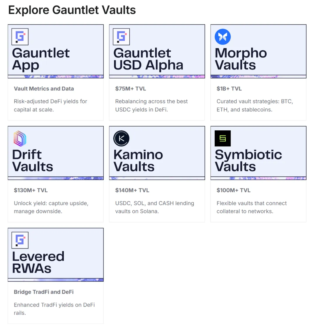 - Gauntlet USD Alpha(gtUSDa):一个多策略金库,提供跨链稳定币收益。用户可以在以太坊、Base、Arbitrum 和 Optimism 上向金库存入 USDC,并无缝获取来自整个 DeFi 生态系统的稳定币收益。
