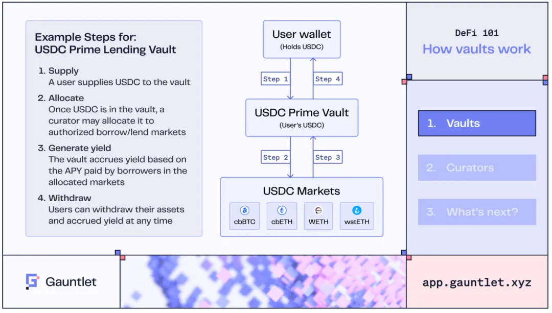 管理人(Curator)接受链上投资者的资本以获取收益,通过金库(Vault)在不同领域进行资产配置。类似于传统资管,即通过资产管理为投资者创造回报。