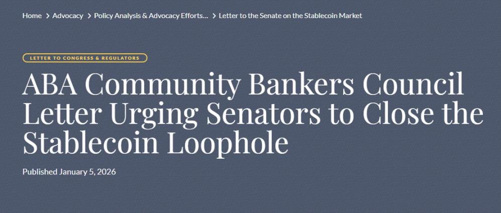 美国银行家协会(ABA)是呼吁全面禁止稳定币利息支付的最主要团体。该协会在 1 月 5 日发布的一封公开信中主张,《GENIUS 法案》中的利息支付禁令不应只适用于发行方,还应进行广义解读,并将适用范围扩展至关联方。他们正推动将这一解读明确写入《加密市场结构法案》。