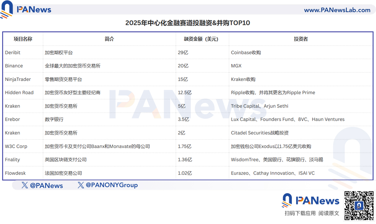 中心化金融历来是整个行业中平均融资额最高的垂直领域,2025 年更是达到了 9337 万美元。这主要是因为 Coinbase 斥资 29 亿美元收购 Deribit 等大额收购案,以及币安单笔获得 20 亿美元资金的超大额融资事件极大地拉高了资金规模。而就算忽略这些大额交易,中心化金融赛道整体仍然表现不俗:该赛道共有 73 起投融资达到千万级别,占比高达 60.83%,在 2024 年 43.48% 的较高基础上进一步得到提升。