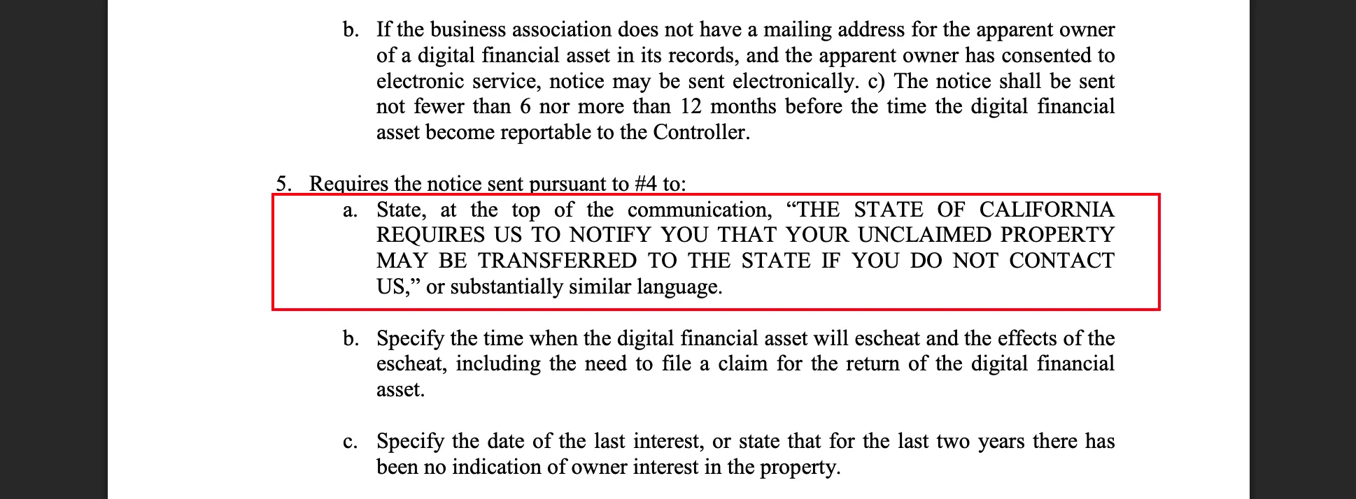 根据规定,交易所作为资产持有者,必须在将资产上报给州政府之前的 6 到 12 个月内向用户发送通知。这种通知并非普通的用户协议更新,其格式有着严格的法定要求,通知的顶部必须用醒目的粗体字写明:“加利福尼亚州要求我们通知您,如果您不联系我们,您的无人认领财产可能会被转移给州政府”。