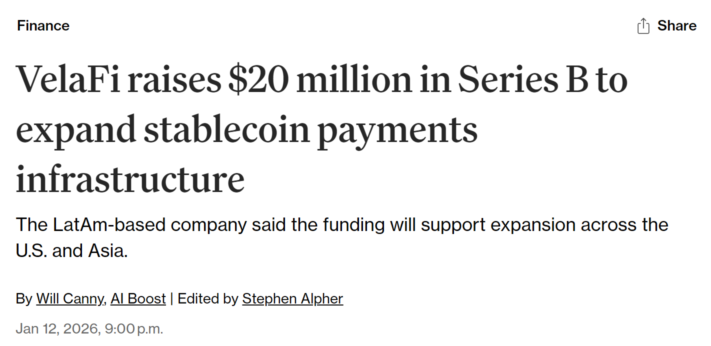 - 稳定币金融基础设施提供商 VelaFi 完成 2000 万美元 B 轮融资,XVC 和 Ikuyo 领投