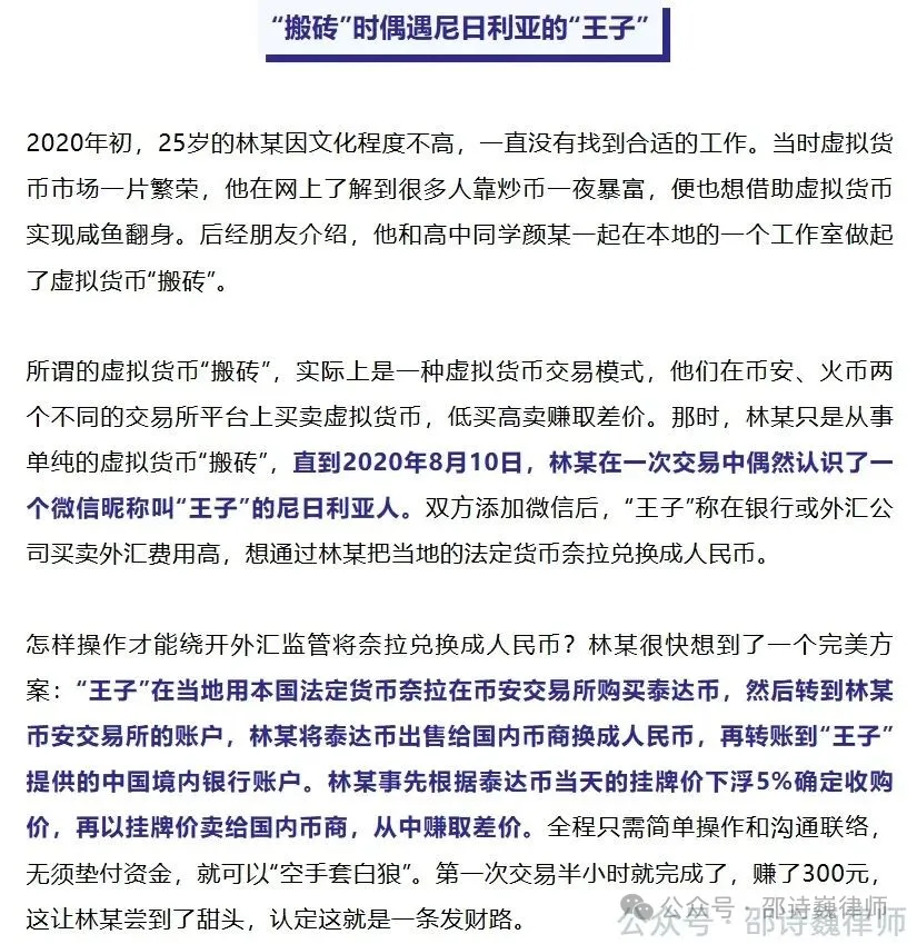 从案情看,林某所谓的 “搬砖套利”,实质上是受尼日利亚人 “王子” 指示操作:王子将奈拉转入林某的币安账户,林某再将收到的 USDT 出售给国内 U 商兑换成人民币,并将资金回转给王子。林某以当日 USDT 挂牌价下浮 5% 确定收购价,再按挂牌价出售给 U 商,从中赚取差价。