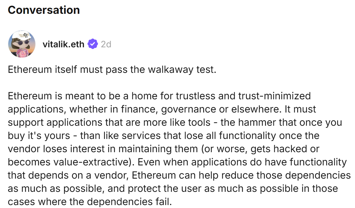 - Vitalik:以太坊必须通过「离场测试」,实现长期稳定