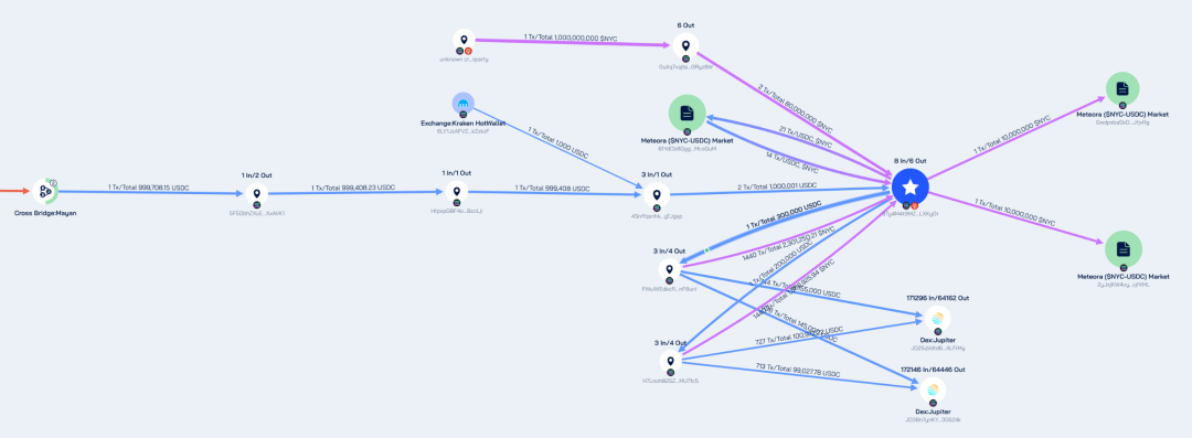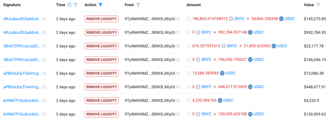 地址 9Ty4M 从 Mayan 跨链桥和 Kraken 用户地址获取了 1,000,001 USDC,随后创建了 NYC-USDC 的流动性池。在北京时间 1 月 13 日 6:43 移除流动性导致价格暴跌后,地址 9Ty4M 从当天 16:15 开始持续小额买入 NYC 代币,持续到现在。