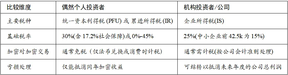 对机构投资者与公司而言,法国对加密资产的课税遵循企业会计准则的实现原则。Crypto-to-Crypto 通常需要按照公允价值变动确认损益,即使未兑换为法币,也可能产生即时税义务。这一处理方式与传统金融资产的会计准则保持一致,要求企业在每个会计期末对持有的加密资产进行估值,并将未实现的资本利得或损失计入当期应税收入。此外,机构投资者的资本损失可以结转以抵消未来年度的公司总利润,为企业提供了更大的税务规划空间。