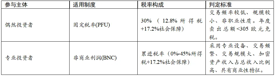在税收层面,法国税务总局(DGFiP)根据参与主体的交易性质与频率,将其划分为多个类别,分别适用不同的计税逻辑与税率。偶然投资者适用 30% 的固定税率,而专业投资者适用 0%-45% 的累进税率。此外,加密矿企、DeFi 参与者、NFT 交易者、交易所等不同参与主体因其经济实质的差异,分别适用非商业利润(BNC)、企业所得税等不同的税收制度。这种精细化的分类计税体系既体现了法国对加密活动多样性的认可,也为不同参与主体提供了相对透明的税收预期。