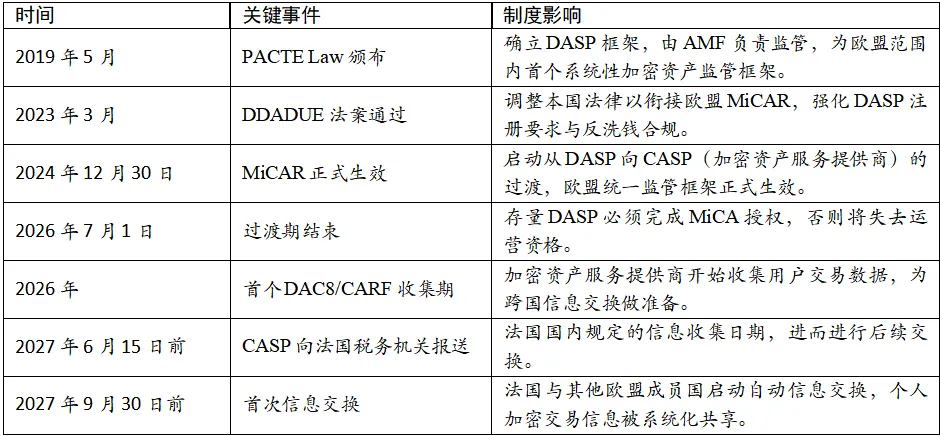 在法国加密税制的演进过程中,2019 年《PACTE 法案》确立了加密资产的法律地位,2023 年专业投资者的税收制度从工商利润(BIC)调整为非商业利润框架,伴随着 DAC8/CARF 框架的落地,2026 年成为加密交易信息实现跨境自动交换的首个年度,通过加密资产的匿名性避税的时代或将终结。一系列的制度变化反映了法国在平衡创新扶持与税收合规之间的持续调整。下表梳理了法国加密资产监管与税收的关键时间节点: