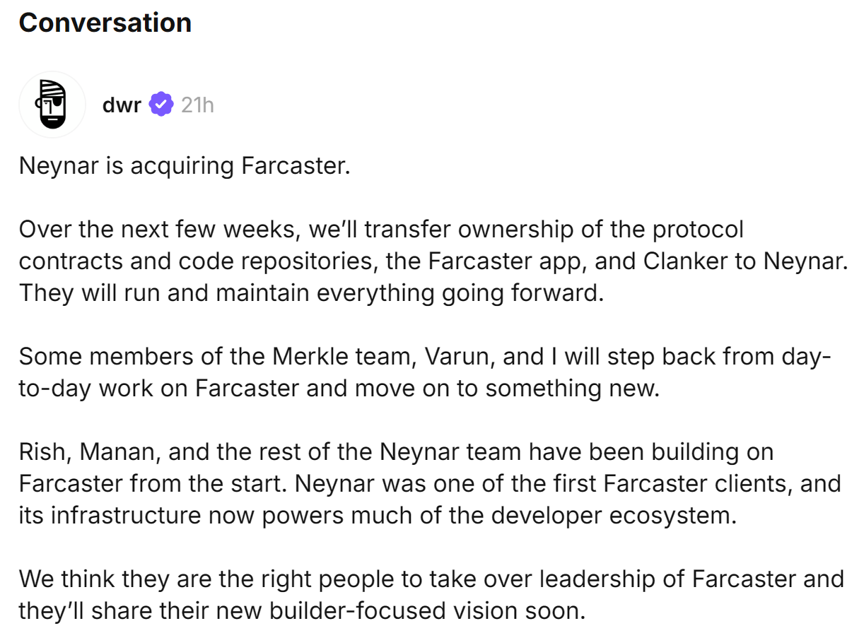 - 去中心化社交网络工具 Neynar 将收购 Farcaster
