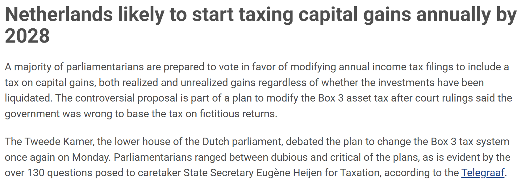- 荷兰议员计划支持从 2028 年起对包括加密资产的未实现收益征税