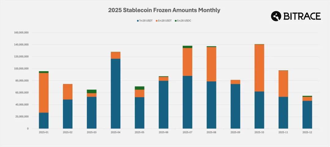 在上一年的犯罪报告中,Bitrace 曾披露 Tether 在 2024 年大幅度提高了执法协作活动,冻结了远超往年数量的区块链地址,而在 2025 年这一举措甚至更为积极,当年所冻结地址数超过 2024 年一倍,凸显该公司在合规领域的重视。