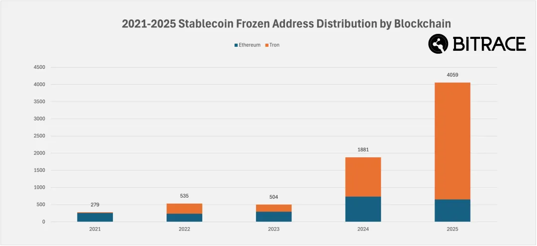 在排除掉部分合约地址与异常地址后, 2025 年遭到冻结的地址数量仍然达到了创纪录的 4059 条,超过过去四年的总和 3199 条,其中以太坊地址遭冻结 653 条,波场地址遭冻结 3406 条,后者几乎全部由 Tether 执行。