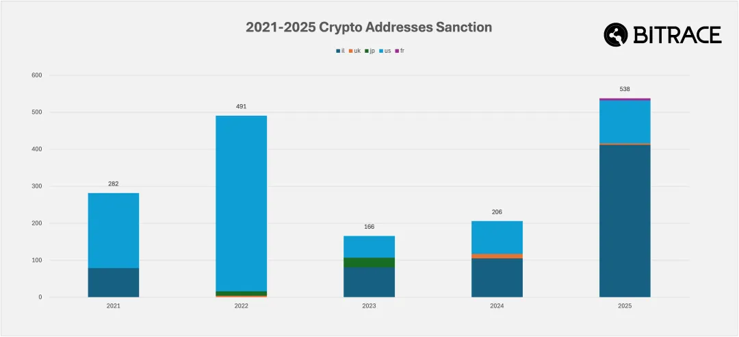 在 2021 至 2025 年期间,五国(排除中心化加密交易所账户)共对至少 1,683 个区块链地址实施制裁,其中美国 OFAC 数量最多,以色列 NBCTF 居次。以色列的大部分制裁发生在冲突期间,主要针对涉嫌为哈马斯、真主党及伊朗相关实体提供资金的加密货币地址。